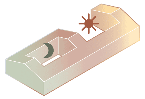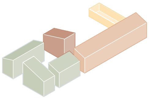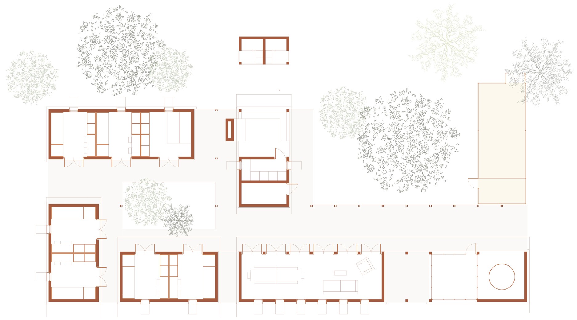 Five blocks are grouped around two main courtyards, the biggest of which integrate the existing trees into the new layout. The south-west courtyard surrounded by the three bedrooms blocks has a more closed configuration compared to the north-east one which is defined by the living and kitchen blocks and has a more permeable appearance.
