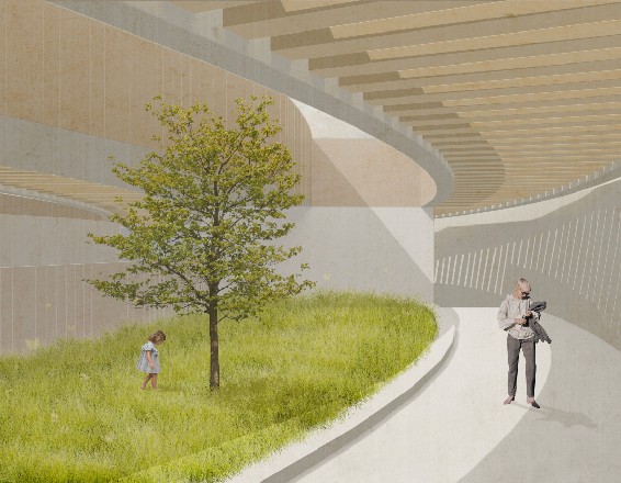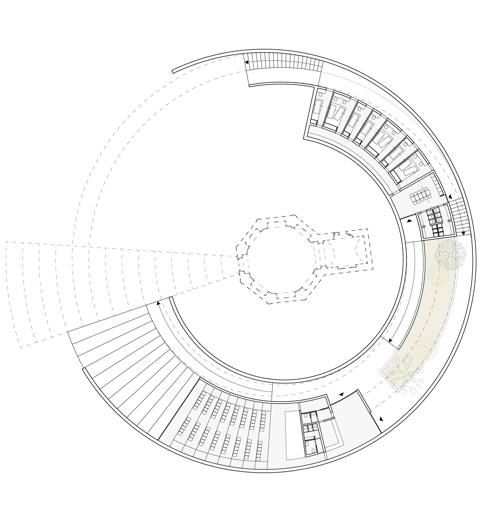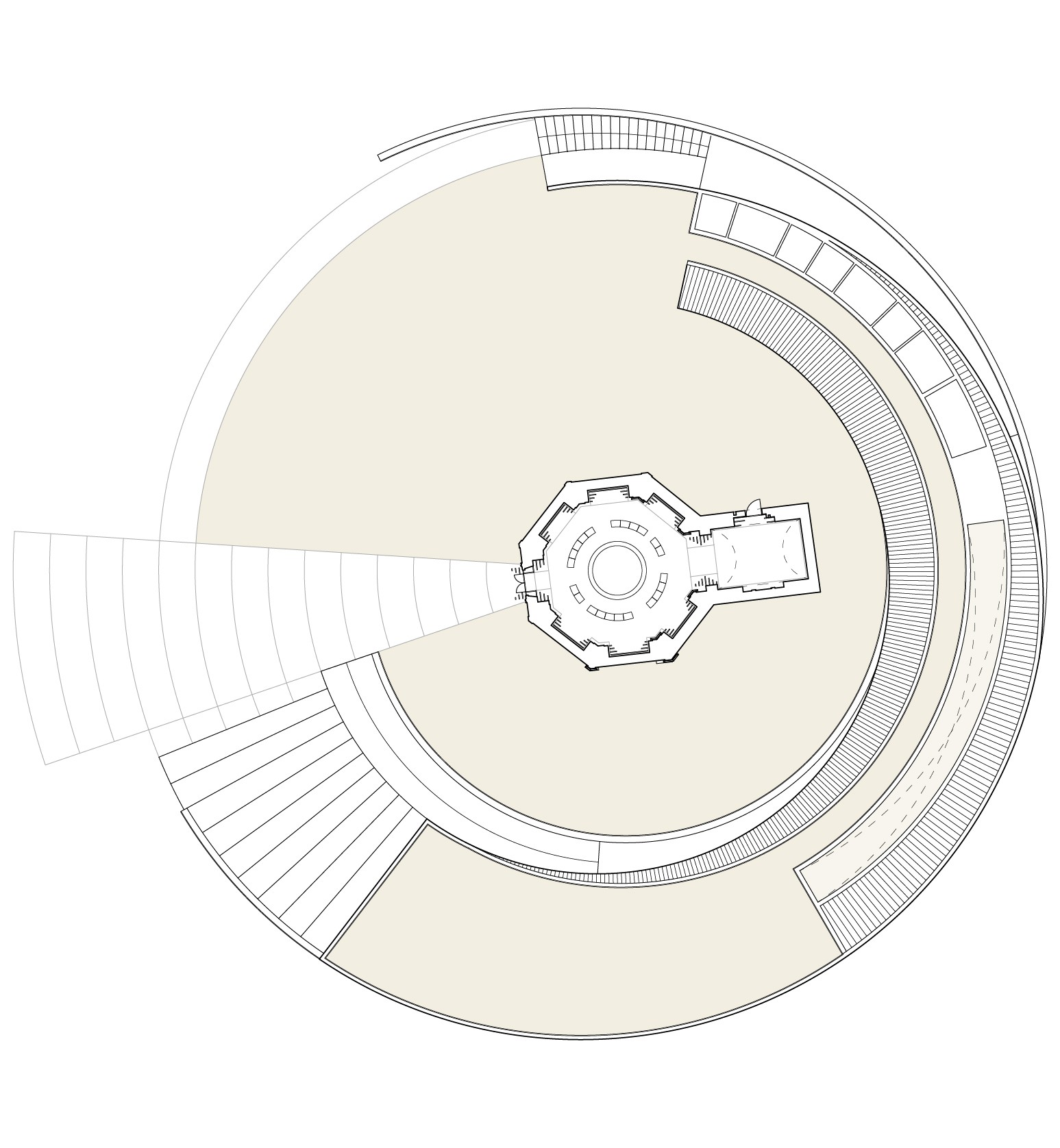 The new addition containing the pilgrim center is a building that wants to blend in with nature and almost disappear by partially sinking into the ground. It’s a loop that formally reinterprets the concept of pilgrimage, with the idea of recreating a path or “loop” within the building itself that is a metaphor for the pilgrim's journey.