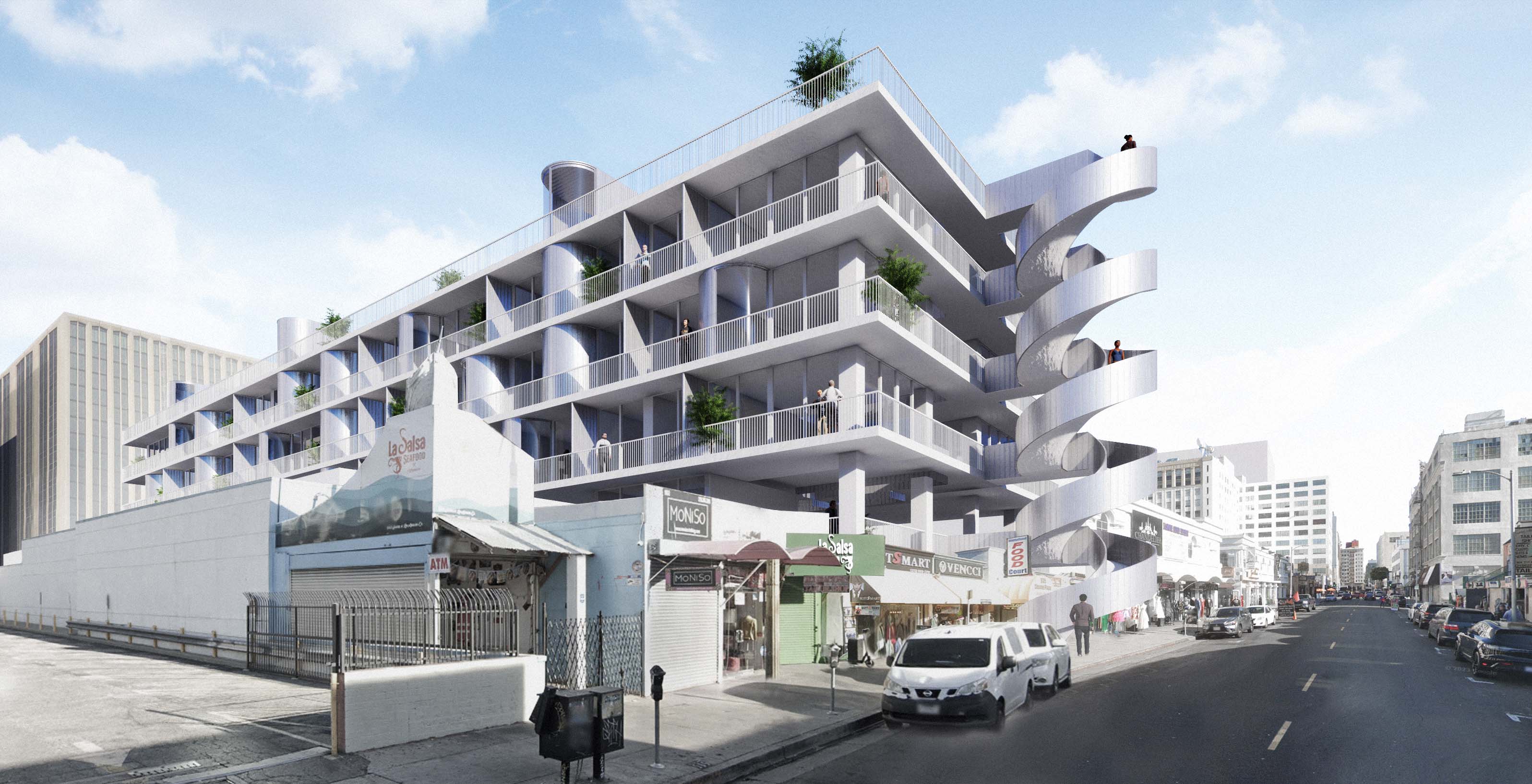 What if Los Angeles became a city where reliance on cars significantly diminished, transforming the vast parking spaces into available land? Could we envision a system where downtown parking facilities gradually evolve into affordable housing units as the number of vehicles decreases? This future anticipates a surplus of abandoned parking facilities resulting from the shift to sustainable transportation, creating an opportunity to redevelop these spaces into new collective areas for the city. The growing number of vacant parking facilities could serve as social platforms for the development of new, affordable housing units