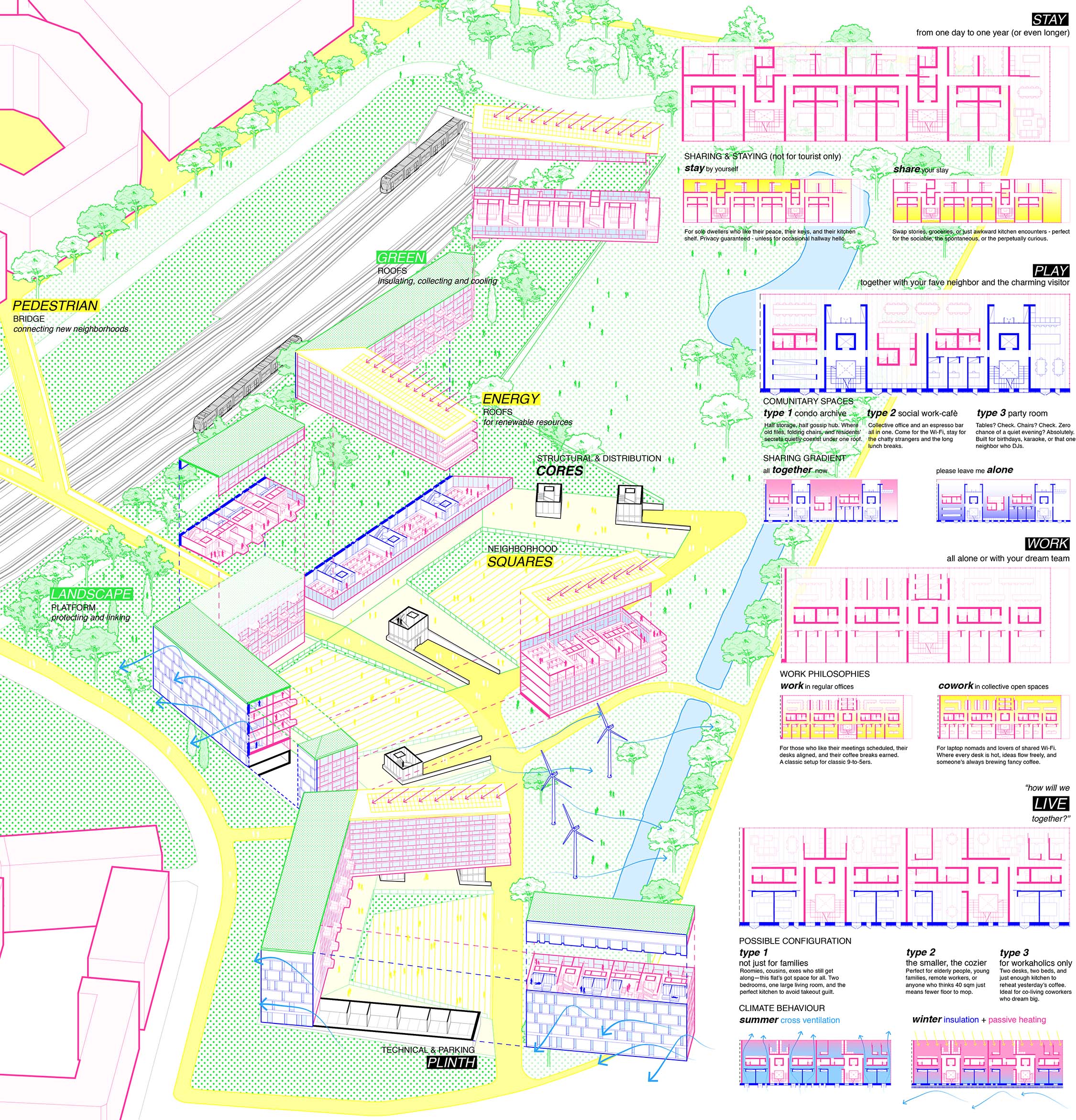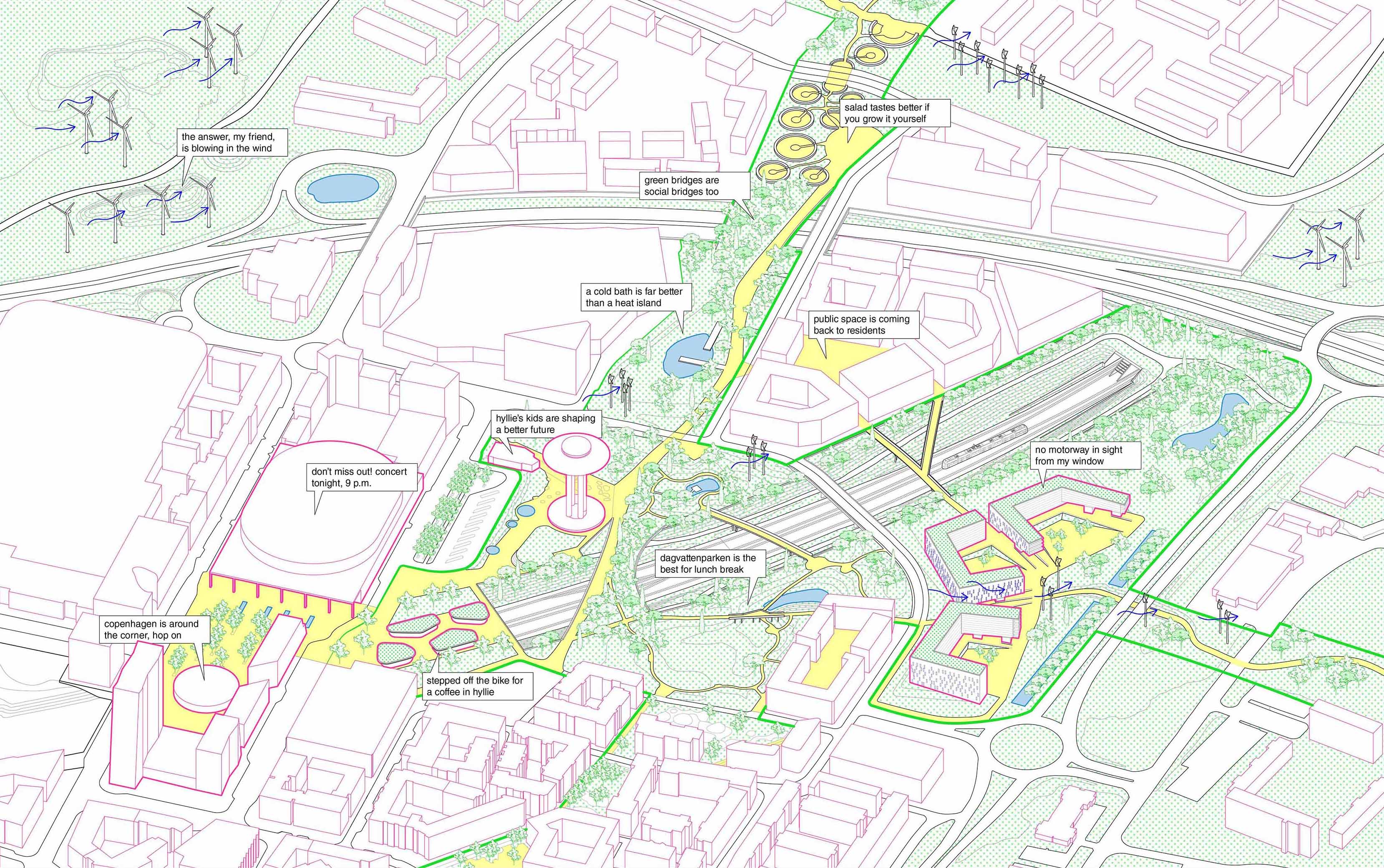 In the complexity of the contemporary world, cities are the place to be. In Europe, more than 77% of the population live in urban areas, and counting. Two oppositional forces seem to be driving the development of cities: cutting-edge technology and large network connections as opposed to proximity, nature-balanced lifestyles. Hyllie is a symbol of this cooperative endeavour. The neighbourhood is central to the route between Copenhagen and Malmö and, at the same time, a self-reliant microcity. Here, urban and rural intertwine, offering brand new buildings as well as vast permeable surfaces. In some way, we can say the crucial strategies of our project were already there, waiting to be applied.
