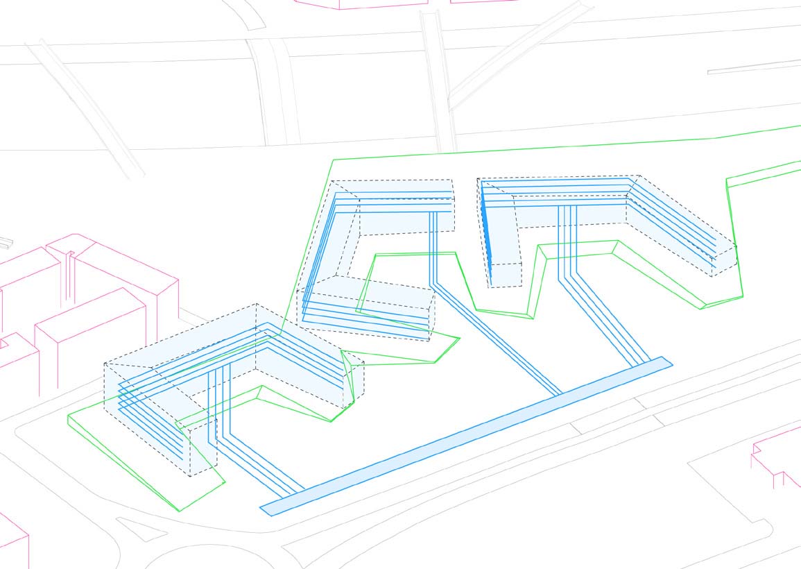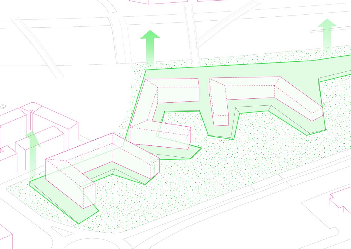 Three buildings take place in the brownfield site between the two lowered infrastructure. The concept for this units is driven by the 3 R’s, Re-Sourcing, Re-Use, Re-Cycle. Natural elements shape the buildings. Soil is restored and becomes a living element that hosts annexes and parking lots, resolving the height differences between the car route and the site. The “barrier” reaches the ground, providing a shield from strong winds and noise pollution, instead the cantilevered portions permit a nice air flow at ground level. Buildings are more open to the sun at east, with a continuous glass façade punctuated by balconies. The courtyards, common typological elements in Hyllie, open up and become a single, seamless public space, the door to the neighbourhood when entering from Lindeborg. The buildings relate to the alignments and heights of the existing fabric, with a maximum of seven floors towards Hyllie and a minimum of three overlooking the re-naturalized area.